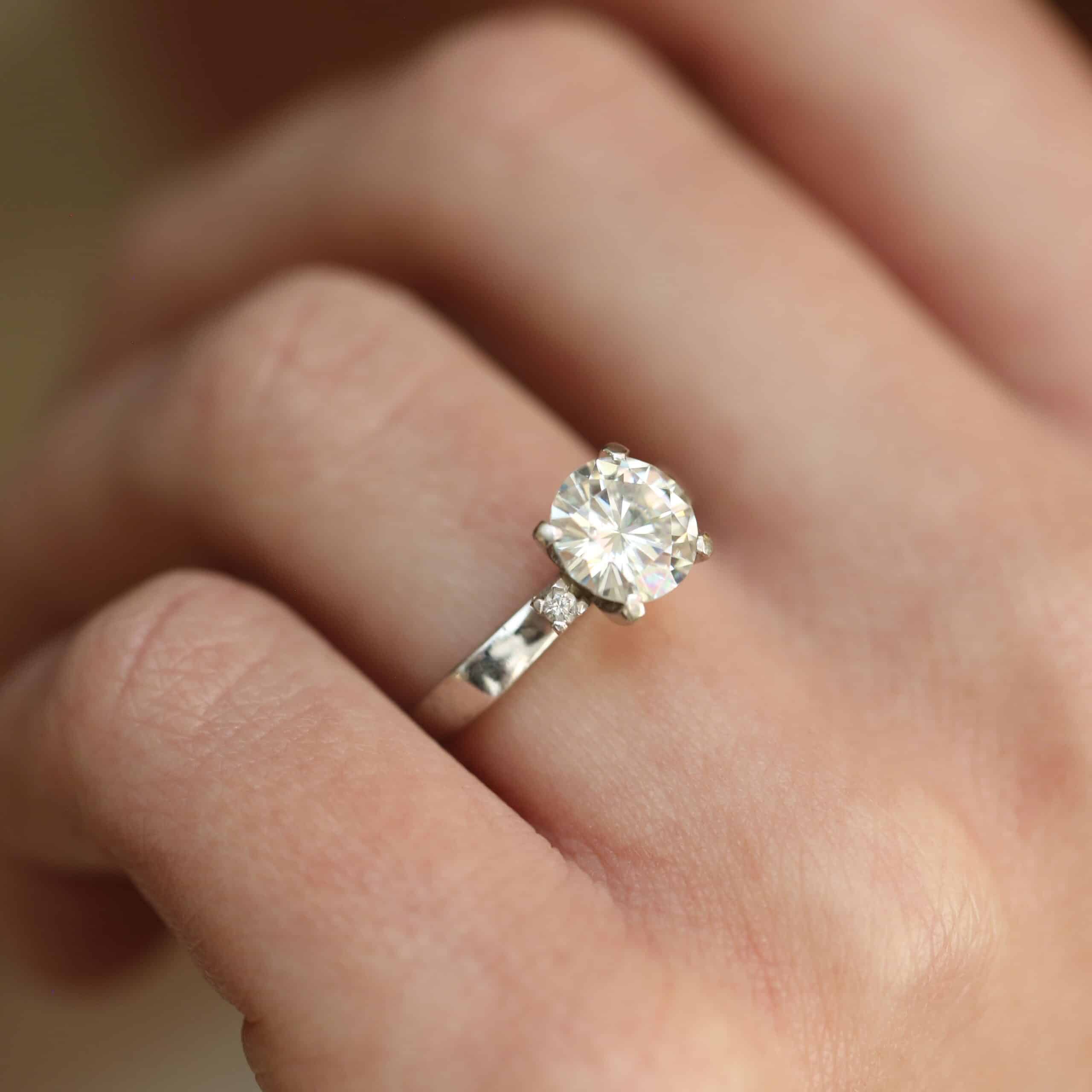 hvidguldsring i 14 karat, med stor regnbue moissanite sten